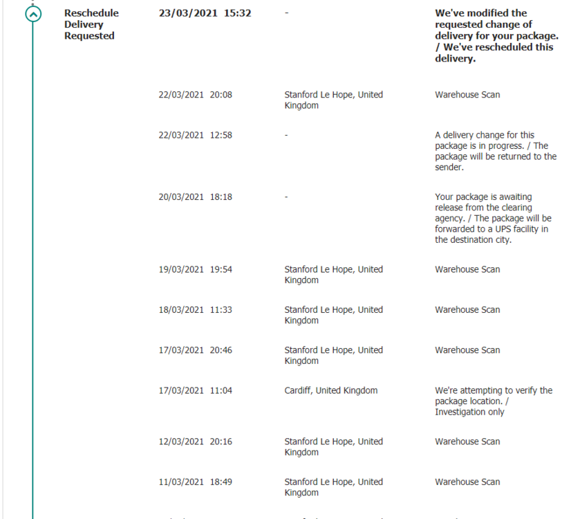 i guess its coming back to me now ? after having a return to sender alert and then warehouse scan and now its been modified, they have rescheduled delivery ! i guess its coming back to me ? UPS are by far the most complicated company I've heard of !!! The delivery notes arent updated and when they are ! they arent clear -
