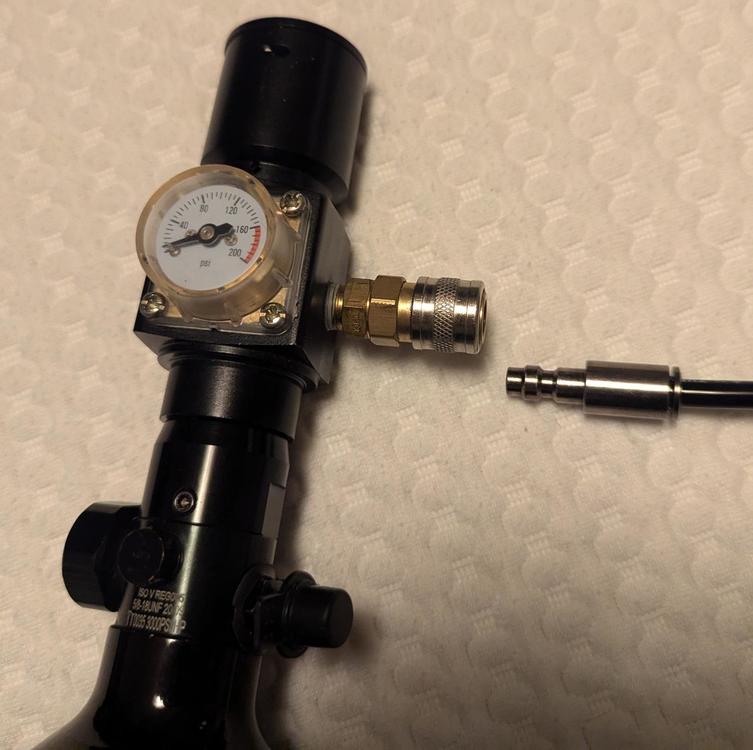 The fitting on the right is the tail coming off the magazine adapter... I presume I'll be aiming for about 80psi into the gat, so a 200psi line would be fine. I have a proper chunky metal line coming off my own scuba tank, so don't need another whip line... I think! Watching YT vidz (which of course I should have done earlier) looks like a simple line with quick disconnects on each end will do just fine. I perhaps need a key for the pressure regulator, though I can turn it just with my thumb pressing down on it so far... Not sure if that'll be the same once it's pressurised, so best get one?