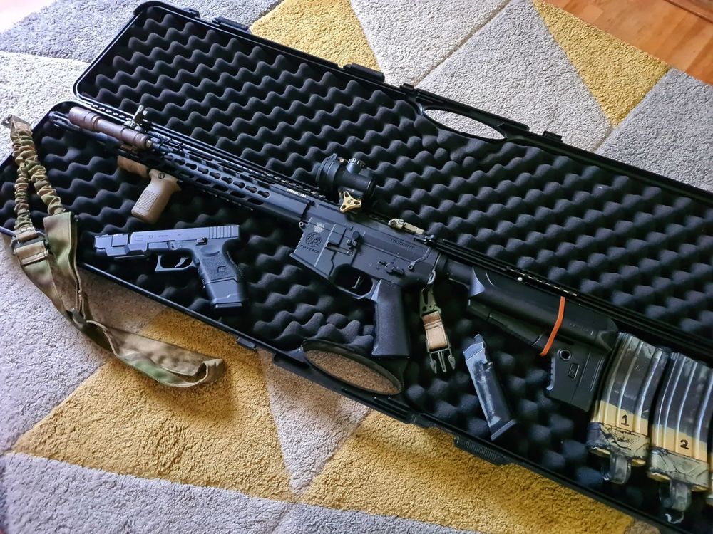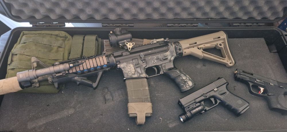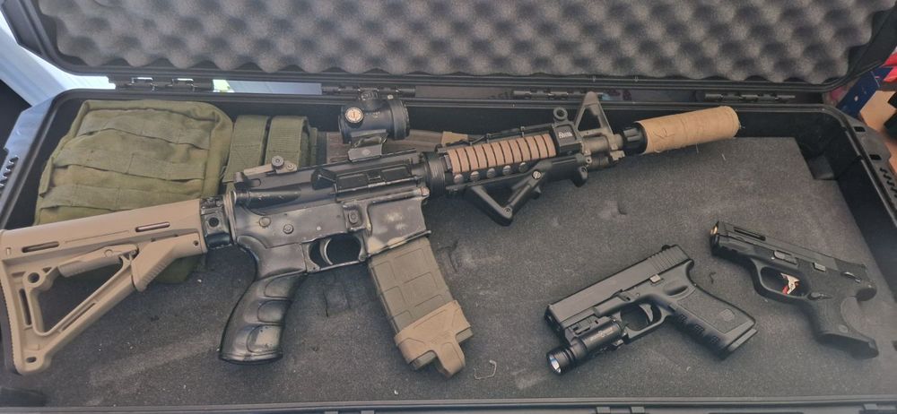 My krytac Mk2 SPR with surefire clone, trijicon MRO, Stubby PTS grip, genuine Magpul sights and 1 point sling, along with my WE Glock 33 advanced.
