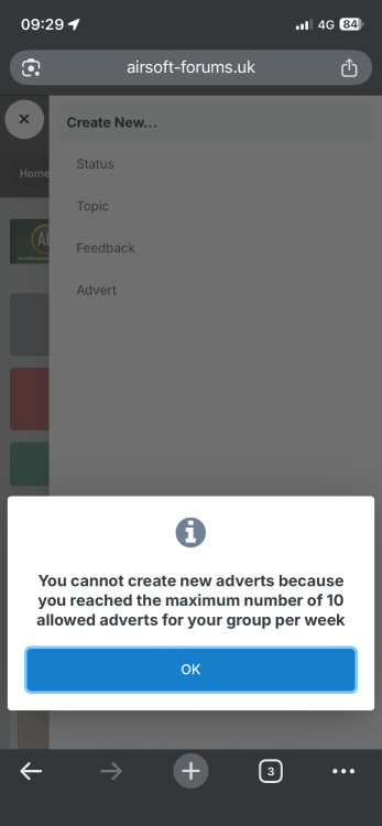 Hi everyone, Has anyone else had an issue posting new adverts into the classifieds section? I’ve been getting an error message for the past three weeks saying: ”You cannot create new adverts because you reached the maximum number of 10 allowed adverts for your group per week” At present (and for past week or two) I only have 3 adverts live (not completed) so I should be below this limit of 10 adverts. I have tried contacting the admins via the contact us function a couple of times but not heard anything back. I guess my question is, is this just me and is there any other way of getting in touch with an admin? My first time writing a post on here so I hope I’ve found the correct subsection to put this.