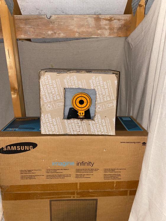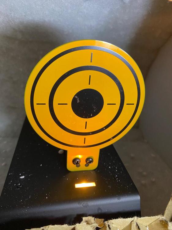 8. It finally arrived from China and I’ve setup a makeshift shooting range in the attic. I’ve used a Gusto box for the target with a small window in the hope that it would catch the bbs but you would need something a lot deeper than that. The BBs were bouncing back everywhere. The actual device looks solid. The front seems metal or a very sturdy plastic. The app is a bit limited. It basically just offers two modes - sequential and random. With sequential all targets pop up at once and they stay down until you have hit all or you have random mode where the targets pop up randomly (but not with a random delay). The added light is nice. We’ve switched off the lights and did some shooting. I think the app is letting the target down a bit. It should have random start delays with a beep when it starts and it should have an optional random delay with bringing up the targets (in random mode). I’ve added a close up of the target after about 50-70 hits. You can see some small dents but I recon the target will last a while. You can by replacement targets for it or you could make them yourself. They just screw into the hinge. I guess you could make the target smaller if you want. The target taught me a few things so far I am rubbish at shooting pistols (only tried with pistols so far) Fiber optic iron sights don’t do anything when it is really dark (time to buy a red dot for my aap ? The target needs to be recessed a lot further to catch more BBs. One target is not enough, you will need at least 3 to make it more fun (in random mode) BBs don’t survive hitting metal things, I’ve had a lot of shattered BBs lying around. Always wear Eyepro! They will come back to you but not with force.