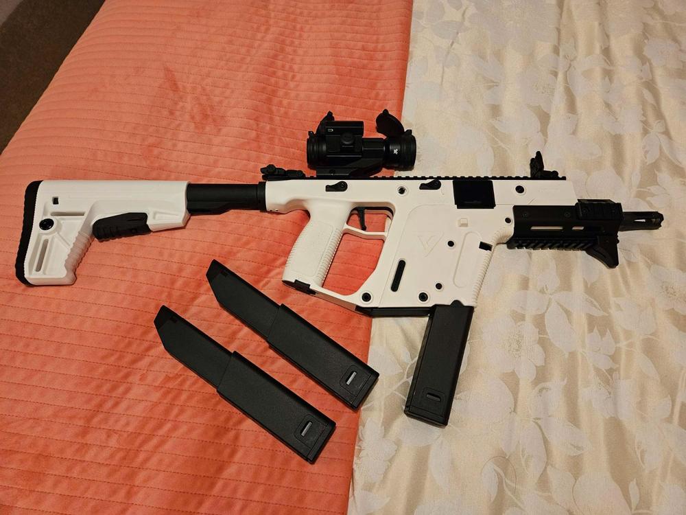It is with a heavy heart I am selling this gun that I have poured hours into, building it and and heavily modifying it as I am now moving on to my next project gun. This gun was built primarily as a test of how well I am able to build a gun completely on my own. It is very snappy with a short cycle thanks to its dual sector gear and it has been shimmed to eliminate the whiny noise you hear from a typical aeg, and has an extremely high fire rate of 60 RPS! (3600 RPM). This gun also contains a custom machined tappet leg made of 7075 aluminium in order to resolve the common issue of the leg snapping off when built in this configuration and has a Perun ETU built into it. There's a bit too many to mention what I did here so I will just list it below: - SHS 18:1 dual sector gear set (Sector gear has one tooth shaved off on each side of the release side to resolve tappet timing issues) - Warhead Base 45k RPM Brushless Motor - Airtac Speed trigger - SHS Nylon piston with steel teeth - FPS Softair piston head - Lambda 280mm 6.03 Steel inner barrel - 3x Mags w/ Superfeed springs installed so it can feed at 60 RPS. - Krytac Vector Perun ETU (2 round burst has been configured to fire at binary) - 10.5 inch outer barrel (stock one included in the box) - Steel muzzle brake - Maple leaf MR Hop 60 deg bucking - Maxx nozzle w/ dual oring 21.5mm - Guarder SP160 spring (please be very careful when taking the gearbox apart, this spring is very strong) - Custom made tappet plate with a 7075 aluminium machined tappet leg - Gearbox modified internally to allow the fitment of the gear set - FLT 8mm Bushings - SHS Steel shims Aside from the shimming the gun has been AoE corrected and unnecessary teeth on the piston has been dremeled off to reduce the weight of the piston. The gun fires consistently at 1.1J with (300 FPS) at 0.25g, dropping down to roughly 0.8J in full auto fire. Comes with the original box as well, and the original barrel & muzzle brake + all of the accessories pertaining to this version of the gun including the certificate stating this gun has a unique serial number of KLB-2695. All of these parts together including the gun costed me just over £1100, but I am asking for £490 for all of this. Payment via PayPal G&S, and delivered via Parcelforce 48 or you can come and pick it up, based near Manchester. I am happy to include videos and more images of this gun if you desire.490.00 GBP