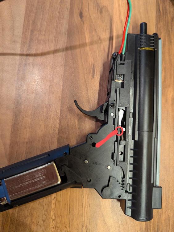 Hello all, I've just gone through the process of my first gearbox shim. Everything's gone well, Up until I put it mostly back together, And check the fire modes. Single... Works fine. Auto... As expected... Safety... Fires auto ? So I had a look online, Seen all the usual jazz about loose selector levers, Wasn't the problem. Cutoff lever is in shape and the springs just fine. The selector plate looks to be in good shape. The cutoff lever is engaging the cam on the gear to the piston perfectly fine, (single works, after all) So I'm at a bit of a loss to what's going on. The only thing I notice is that the small raised level (shown red on image) doesn't move forward enough to engage the cutoff lever which'd stop the trigger from moving. The selector gears can't even move the selector plate forward enough for that, So I presume I'm missing something. Thanks in advance, And if it's something stupid I've missed, I'm really really sorry.