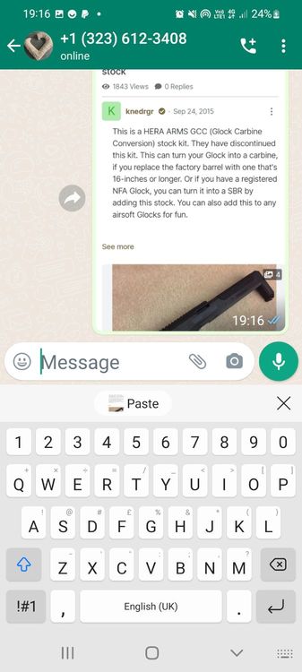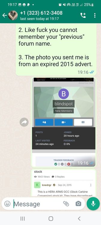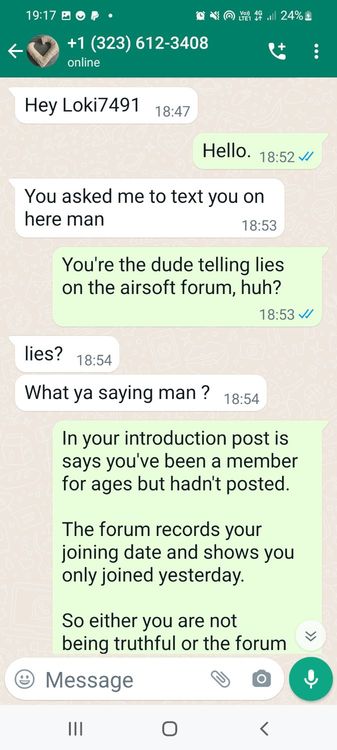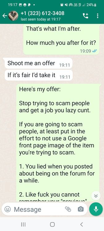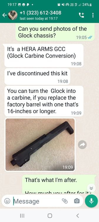There are multiple bits of the chat going back and forth so I'll give you all the TL:DR version. He offered me 3 guns. 2 of which I was interested in. I asked for additional photos and videos. The asking price was £900 for the pair which would have been at the very top of the budget, so I wanted to make sure they were in the very top of condition. All new photos were photoshops of previous photos. The videos were indistinguishable as they were in the dark, shooting tracer. After confirming my suspicions, I called him on it and he confessed. Be wary boys and girls. Happy new year to you all.
