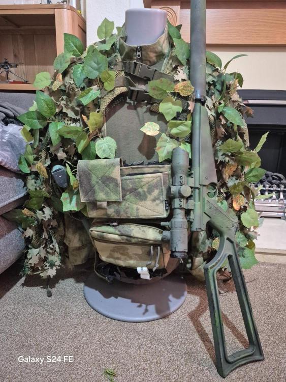 As a starter for 10 points, all made up from gear i already had. 1. Crafted Novvi cape in everglade. 2. Cheap micro chest rig in ATACS-FG 3. Walther P99 with suppressor 4. KJW Ruger Mk1 cabine with a 2-7x32 EDIT: the suppressor on the MK1 is made from a pool cue extension handle, 3D printed baffles, foam inserts and an aluminium over tube. The actual suppression is only about half of the tube. Currently set up for 5 KJW mags (4+1) and the same for the P99. Primary can be swapped out for M4 based mags for AEG DMR if required. Ruger is currently doing circa 475fps so a good starting point in terms of power. Garden isn't long enough to dial in hop for max range test, so that'll have to wait. Also got an option for carrying Ares Stryker mags so I can steal my sons boltie if required. I had a WE M14 with 7 mags on a belt kit. Weighed a frigging tonne but when I'd fine tuned it, it sent Madbull .36 for miles. Apart from the weight, cost and inconvenience of 20 round mags in such a beast, I loved it.